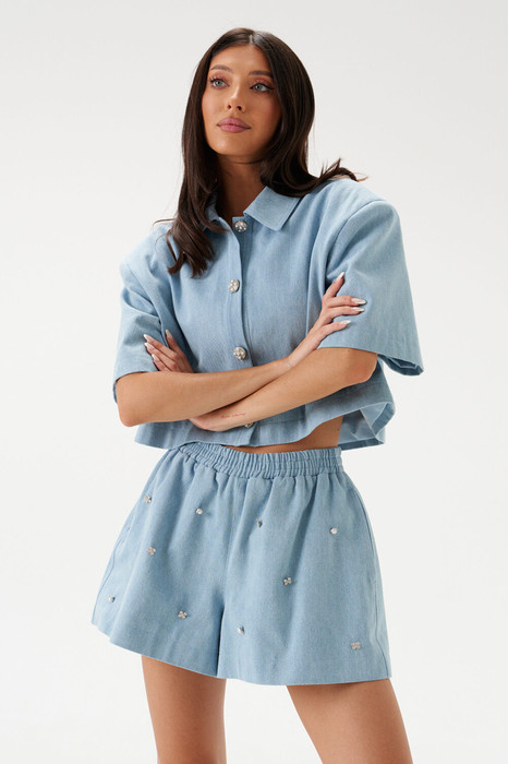 Шорты широкого свободного кроя, выполнены из джинсовой ткани. Перед декорирован мелкими деталями. Пояс на резинке, подкладка. Имеет две отделочные строчки по краям, в боковых швах карманы. Длина 40 см