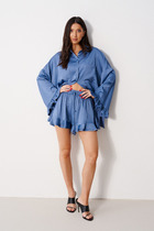 Шорты свободного кроя, выполнены из струящайся ткани синего цвета. Пояс на резинке с кулиской, по низу шорт нашита рюша из ткани основного изделия. Длина по боковому шву с учетом рюши - 34 см.