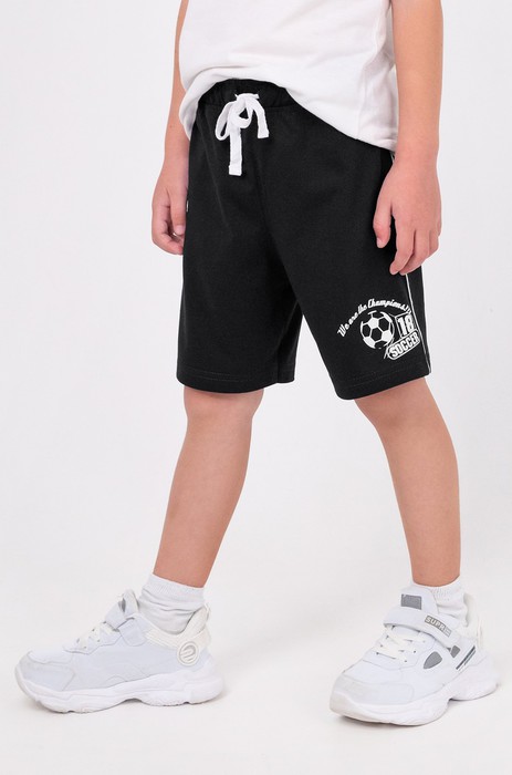 Прямой крой, пояс на резинке с дополнительной регулировкой шнуром. Черные шорты украшены принтом футбольный мяч.