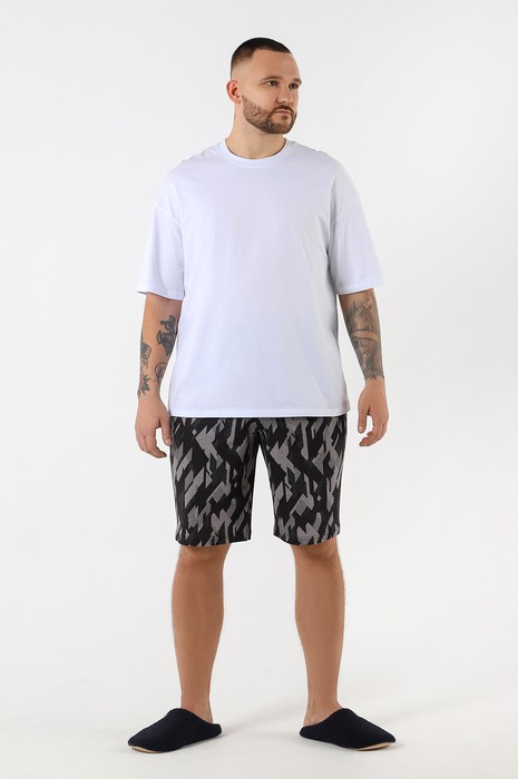Шорты мужские из трикотажного полотна "кулирка" с набивным рисунком, удлиненные, на притачном поясе с эластичной тесьмой внутри, с карманами в боковых швах, входы в которые окантованы основным материалом.