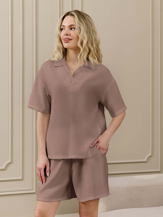 Шорты женские из фактурного полотна средней длины, на притачном поясе с эластичной тесьмой внутри, с карманами в боковых швах. По входам в карманы настрочены отделочные стрпочки. Нижние срезы обработаны подгибкой.