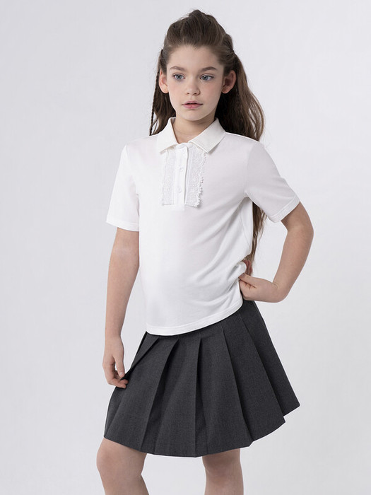 Трикотажное поло для девочки полуприлегающего силуэта с короткими рукавами. Воротник отложной со стойкой . Застегивается на пуговицы расположенные на притачной планке, украшенной кружевом.