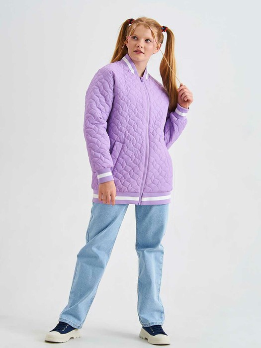 Легкая стеганная куртка -бомбер для девочки с яркими трикотажными подвязами. Дополнена двумя прорезными карманами.