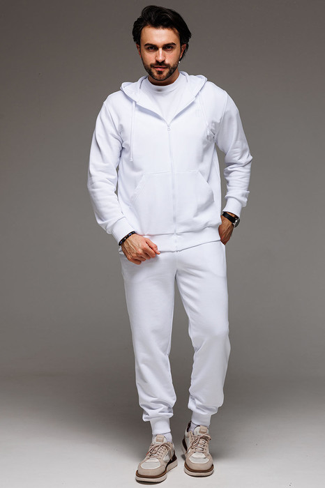 Классический мужской спортивный костюм состоит из худи на застёжке-молнии и брюк на манжетах. Всесезонная ткань сделает его любимым в Вашем гардеробе как для дома, так и улицы.