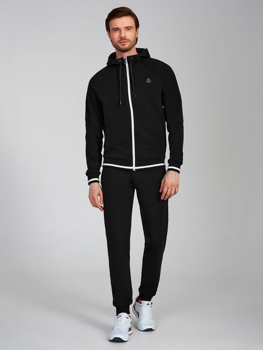 Спортивный костюм из хлопкового трикотажного полотна. Куртка с поясом, с капюшоном и с фронтальной молнией. Рукава втачные. Карманы куртки прорезные . На груди куртки слева и на левой брючине под карманом - фирменный шеврон.. Манжеты и пояс куртки выполнены из полосатого эластичного трикотажа. Брюки с прорезными карманами. Низ брюк с манжетами .Пояс брюк эластичный, по линии талии дополнительно регулируется шнурком.