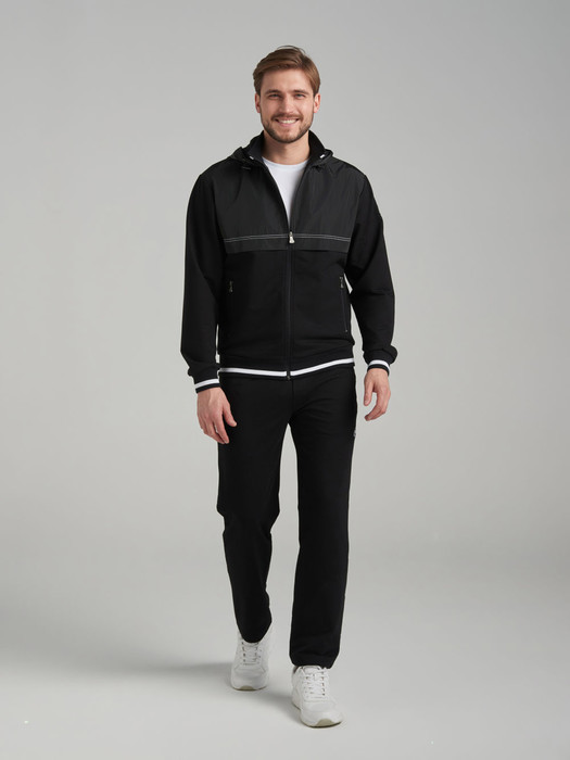 Спортивный костюм из хлопкового трикотажного полотна . Куртка костюма на поясе, с воротником-стойкой, с легким капюшоном, застегивается на молнию. Рукава втачные. Несколько деталей костюма изготовлены из водонепроницаемой плащевой ткани в тон изделия - это капюшон, кокетки куртки, нижние вставки задних брючин. Все карманы комплекта прорезные,застегиваюся на молнии. Лицевая часть капюшона регулиреутся резиновым шнуром с помощью металлических фиксаторов.Пояс, воротник и манжеты куртки изготовлены из эластичного подвяза с узкой белой полосой. Брюки прямые, зауженные книзу. Пояс брюк по линии талии с эластичной резинкой так же дополнительно регулируется шнуром. На левом рукаве и под левым карманом брюк нашиты шевроны с фирменным логотипом.
