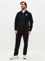 Мужской спортивный костюм из плотного трикотажа с петельной изнанкой. Верх комплекта - толстовка-худи с капюшоном, с накладным карманом "кенгуру". Рукава толстовки втачные, свободные со спущенной линией плеча, с эластичными манжетами. На тактических брюках "Карго" два объемных накладных кармана с клапанамии и еще два кармана в боковых подрезах. Брюки зауженны книзу на резинку. Пояс брюк на резинке, по линии талии дополнительно регулируется шнуром.