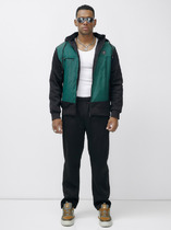 Спортивный костюм с капюшоном, из трехниточного плотного трикотажа с начесом по изнанке. Куртка-худи прямого силуэта. Рукава втачные со спушенной линией плеча. Кокетки куртки, капюшон и нижняя часть задней брючины продублированы водонепроницаемой плащевкой.Карманы накладные "кенгуру". Манжеты рукавов и брючин и пояс куртки из эластичного трикотажа. Брюки с прорезными карманами на молниях, Низ брюк заужен анжетами. Пояс брюк по линии талии с эластичной тесьмой, дополнительно регулируется шнуром.На груди и на брюках под карманом - термотрансфер с фирменным логотипом.