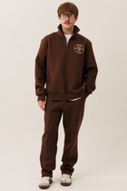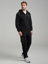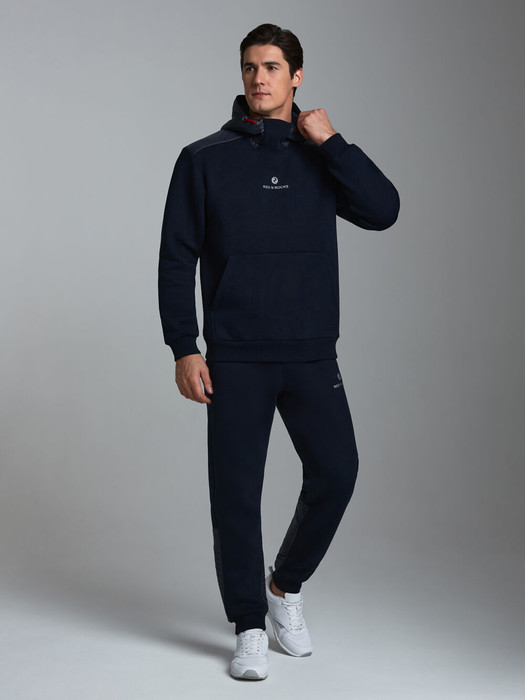 Спортивный костюм с капюшоном, из трехниточного плотного трикотажа с начесом по изнанке. Куртка-худи прямого силуэта. Рукава втачные со спушенной линией плеча. Кокетки куртки, капюшон и нижняя часть задней брючины продублированы водонепроницаемой плащевкой.Карманы накладные "кенгуру". Манжеты рукавов и брючин и пояс куртки из эластичного трикотажа. Брюки с прорезными карманами на молниях, Низ брюк заужен анжетами. Пояс брюк по линии талии с эластичной тесьмой, дополнительно регулируется шнуром.На груди и на брюках под карманом - термотрансфер с фирменным логотипом.