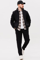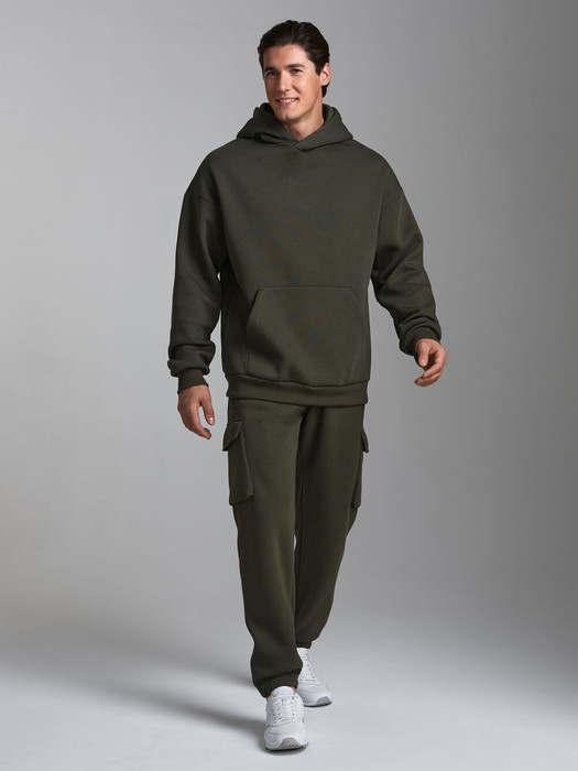 Мужской спортивный костюм из плотного трикотажа с изнаночным начесом. Верх комплекта - толстовка-худи с капюшоном, с накладным карманом "кенгуру". Рукава толстовки втачные, свободные со спущенной линией плеча, с эластичными манжетами. Брюки "Карго" с объемными накладными карманами, с клапанами, имеют два дополнительных кармана с молниями в боковых рельефах. Брюки к низу заужены на резинку. Пояс брюк эластичный, по линии талии дополнительно регулируется шнуром.