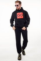 Спортивный костюм изготовлен из плотного хлопкового трикотажного полотна с изнаночным начесом. Куртка костюма на поясе, с капюшоном, застегивается на молнию. По плечам и верхней части рукавов есть вставка, выгодно подчёркивающая линию плеча. Комфортный двухшовный капюшон со стойкой по лицевой части регулируется шнуром. На куртке есть удобные карманы «кенгуру». Пояс и манжеты куртки изготовлены из плотной эластичной трикотажной резинки. Брюки зауженные, низ брюк на резинке. Передние карманы брюк в боковых подрезах. Пояс брюк по линии талии с эластичной резинкой, дополнительно регулируется шнуром. Под карманом брюк, и под швом кокетки куртки - шевроны с фирменным логотипом.