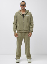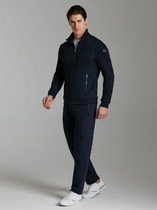 Мужской спортивный костюм из плотного трикотажа с петельной изнанкой. Верх комплекта - толстовка-худи с капюшоном, с накладным карманом "кенгуру". Рукава толстовки втачные, свободные со спущенной линией плеча, с эластичными манжетами. Брюки книзу заужены на резинку. Карманы брюк в боковых подрезах. Пояс брюк по линии талии дополнительно регулируется шнуром.