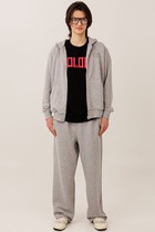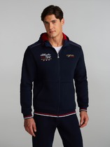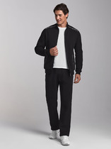 Мужской спортивный костюм из плотного трикотажа с петельной изнанкой. Верх комплекта - толстовка-худи с капюшоном, с накладным карманом "кенгуру". Рукава толстовки втачные, свободные со спущенной линией плеча, с эластичными манжетами. Брюки книзу заужены на резинку. Карманы брюк в боковых подрезах. Пояс брюк по линии талии дополнительно регулируется шнуром.
