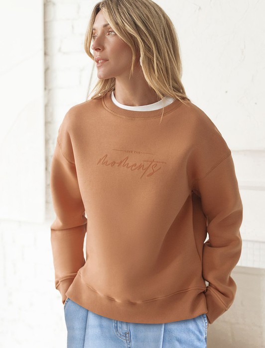 Свитшот с круглым воротом выполнен из премиального футера трехнитки с теплым начесом. Модель дополнена фактурным лаконичным принтом. Перевод: «Живи мгновениями». Свободный крой подходит для любой фигуры и впишется в любой гардероб.