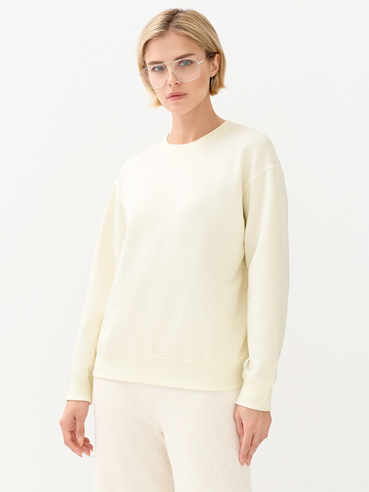 Женский свитшот свободного кроя из двухниточного футера со спущенным плечом, длинными рукавами и круглым вырезом. Манжеты, горловина и низ, оформленные рибаной в лаконичный рубчик, добавляют текстурности и делают силуэт более графичным.