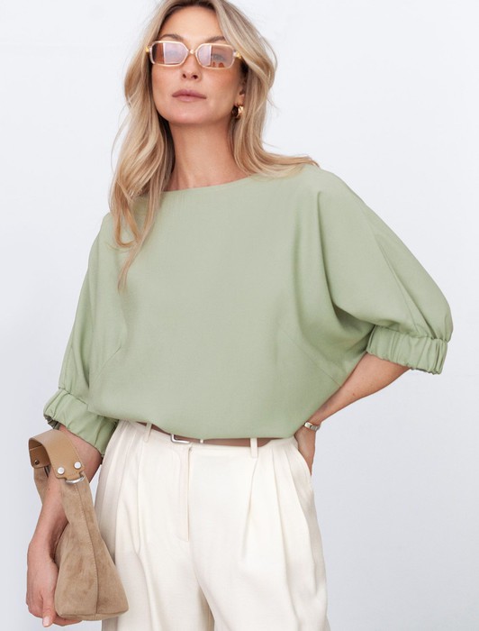Состав: 76%Лиоцелл (Вис) 24%ПЭ Плотность: 180 Г/м2Свободная блузка светло-зеленого цвета выполнена из плотного лиоцелла. Лиоцелл это более дорогой и экологичный вариант вискозы, очень прочный и шелковистый. Современная интерпретация кроя «летучая мышь» дополнена акцентными эластичными манжетами. Эта блузка идеальна для любого типа фигуры, в том числе и на королевские размеры. Этот крой создан для того, чтобы мягко скрыть лишние объемы. Эта повседневная блузка с вырезом лодочка создана для легкого и утонченного стиля. Мягкие линии кроя создают невероятно эффектный образ, который подчеркивает естественную красоту, не стесняя движений, а свободный фасон дарит ощущение абсолютного комфорта и уверенности. Блузка красиво драпируется при движении, создавая летящий, воздушный эффект.