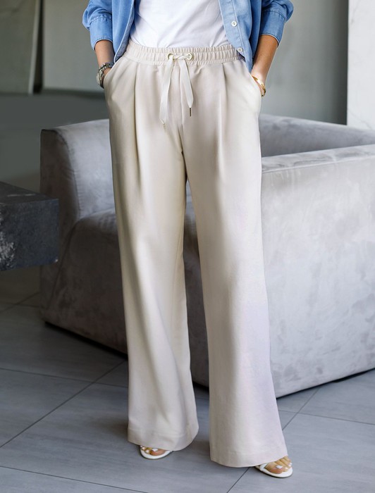 Состав: 75%Хлопок 20%ПЭ 5%ПУ Плотность: 260 Г/м2 Параметры модели на первом фото: Рост 170, бюст 89, талия 63, бедра 92Брюки свободного кроя выполнены из эластичного футера-двухнитки. Модель дополнена защипами и боковыми карманами как у классических брюк и одним задним карманом. Эластичный пояс на резинке с шнурком из репсовой ленты и металлической фурнитурой. Брюки сочетаются в костюме с футболкой D49.031, D49.085, бомбером D49.038 и паркой D49.075