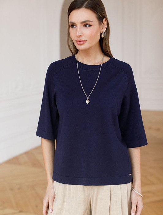 Состав: 80%Вис 20%ПАЛегкий свободный джемпер темно-синего цвета с круглым вырезом идеально подходит на весну и лето. Тонкая вязка из вискозы дарит приятный комфорт и ощущение свежести в теплую погоду. Универсальная длина позволяет сочетать джемпер с разными элементами гардероба. Джемпер отлично смотрится на больших размерах благодаря продуманному крою и свободному фасону. Широкие рукава создают воздушность и делают силуэт особенно женственным. Этот джемпер с рукавом 3/4 станет незаменимой частью гардероба в сезоны, когда хочется легкости и элегантности одновременно. Лаконичный дизайн обеспечивает простоту комбинирования с другими вещами и будет универсальной базой для создания разнообразных комплектов — от офисного до непринужденного городского стиля.