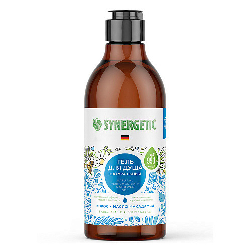Натуральный биоразлагаемый гель для душа SYNERGETIC "Кокос и масло макадамии" — это деликатное средство для очищения кожи, на 99,1% состоящее из натуральных компонентов.