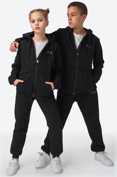 Теплый спортивный костюм с брюками для мальчиков и девочек выполнен из плотного футера с начесом. Толстовка с застежкой на молнию, глубокий капюшон, удобный карман-кенгуру, мягкие манжеты и светоотражающий принт делают костюм невероятно уютным и практичным. Черный костюм для детей и подростков поможет создать стильный образ для любой ситуации.