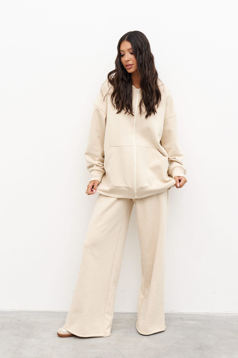 Джемпер выполнен из трикотажного полотна песочного цвета. Характеристики: прямой крой, капюшон, застежка центральная - молния, рукав спущен, по низу рукава манжета, по низу изделия крупный карман. Длина джемпера 71 см, длина рукава 82 см.