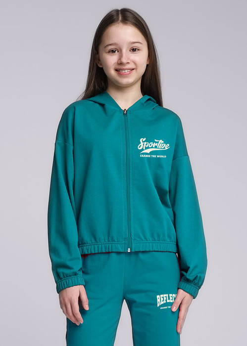 Укороченная толстовка с капюшоном на молнии легко впишется в гардероб. Выполнена из футера с эластаном. Спереди и на спинке - модный принт. Для создания более стильного образа рекомендуем сочетать с брюками в цвет модели из нашей новой коллекции.