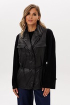Жилет молодежный из трикотажного полотна «дабл-флис» (двухсторонний флис), прямого силуэта, с воротником «стойка», центральной бортовой застежкой на тесьму «молния». Для создания диагональных линий боковые швы переведены на полочку и оформлены в рельефные швы, в которых обработаны карманы.