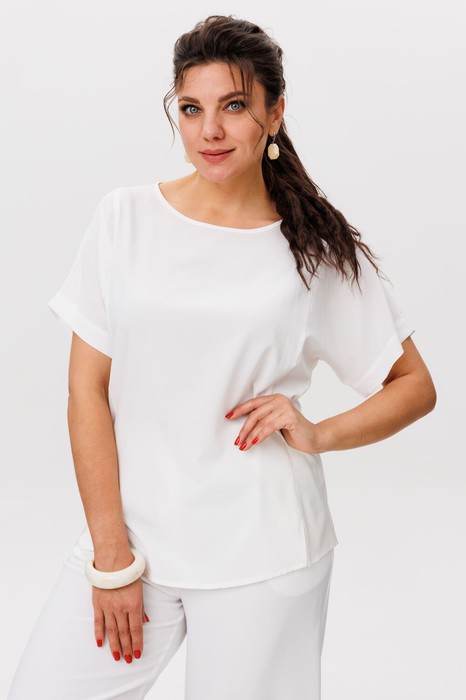 Элегантный округлый вырез горловины подчеркивает женственность, сохраняя при этом сдержанность и универсальность. Передняя часть топа украшена центральной деталью из отделочной ткани, которая придает модели изысканный акцент, не перегружая общий вид.