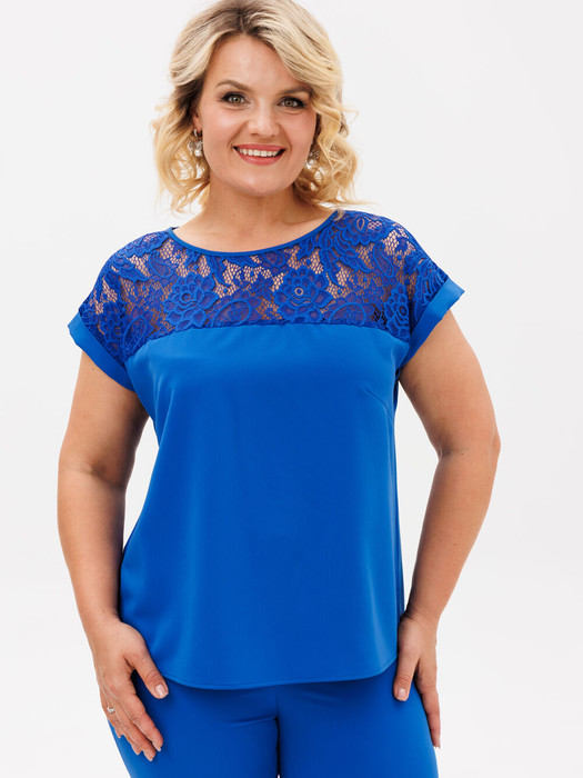 Нарядная блузка из поливискозной ткани с кружевом  на кокетке. Блузка полуприлегающего силуэта, спинка чуть удлиненная, рукава цельнокроеные с отложными манжетами. По переду нагрудные вытачки. Блузка будет отлично сочетается с брюками, юбками вашего гардероба. Длина блузки - 61 см.