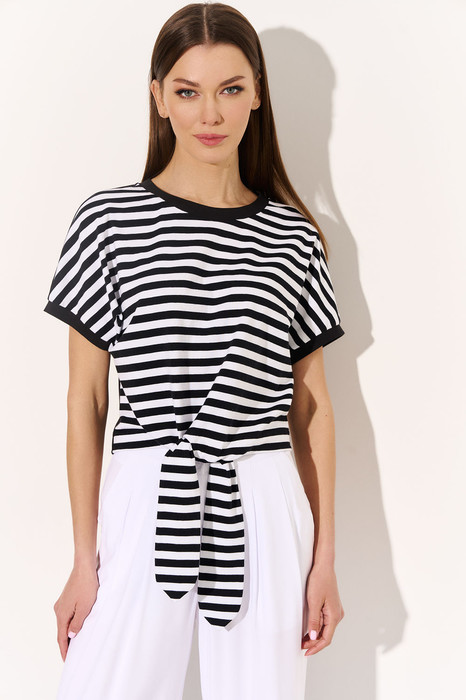 Блузка женская прямого силуэта из тонкого трикотажного полотна. Горловина круглой формы обработана притачной бейкой. Перед из полосатого полотна. По низу переда сформированы завязки.По спинке шов притачивания бейки обработан тесьмой киперной с отделочной строчкой. Рукава цельнокроенные с притачными узкими манжетами.