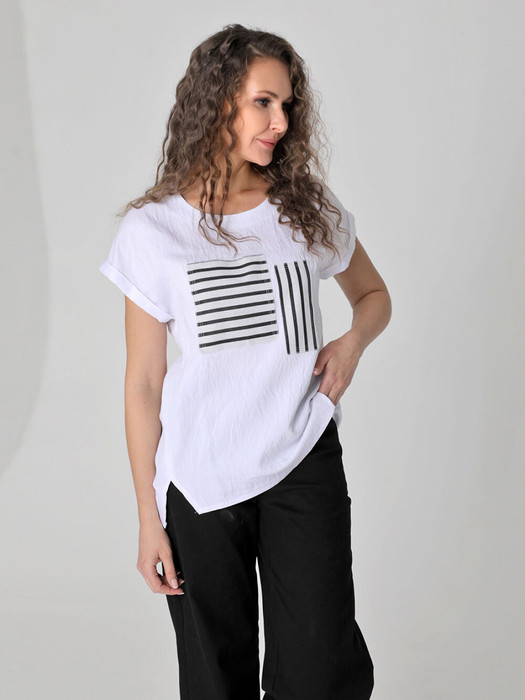 Стильная блуза из мягкой вискозы  прямого силуэта с короткими цельнокроеными рукавами подходит для девушек и женщин разных возрастных групп. Оригинальная аппликация из принтованного льна и разноуровневая линия низа с декоративными разрезами акцентируют модный стиль блузки. Она хорошо сочетается со всеми брюками, жакетами и рубашками из нашей летней коллекции.  Выбирайте понравившийся цвет, подбирайте  обувь и аксессуары, и  эта блуза  выручит Вас летним днем в городе, на прогулке и на отдыхе. Собирайте свои образы, дополняйте их яркими аксессуарами и наслаждайтесь комфортом в летние дни!