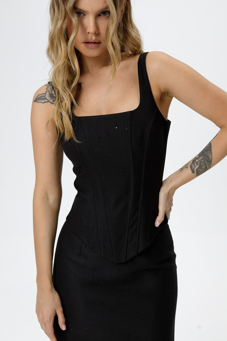 Корсет с глубоким квадратным вырезом из костюмной ткани с пайетками.