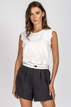 Отделочным элементом блузы является кружево, настроченное на верхней части переда и спинки. На кружево пришиты бусины.