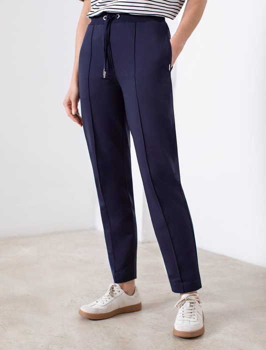 Состав: 95%Хлопок 5%ПУ Плотность: 240 Г/м2 Параметры модели на первом фото: Рост 172, бюст 88, талия 64, бедра 88 Размер товара на первом фото: 42Брюки темно-синего цвета зауженного кроя выполнены из премиального футера-двухнитки. Лаконичный силуэт поддерживают застроченные стрелки, зрительно вытягивающие силуэт. Удобный пояс на резинке регулируется хлопковым шнурком с золотистой фурнитурой. Наличие эластана в составе изделия гарантирует комфорт и долговечность изделия. Эластичный материал хорошо пропускает воздух, позволяя телу дышать, и легко тянется, не ограничивая движения.
