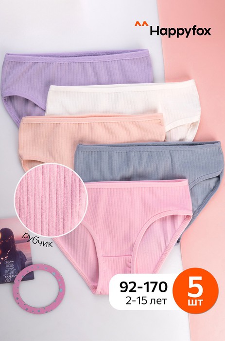 Безупречная классика! Набор трусов в рубчик для девочек и девочек подростков выполнен из трикотажного хлопка. В комплекте однотонные трусики пастельных цветов, 5 шт, в проймах эластичные бейки.
