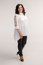Туника женская прямого силуэта из шифона со втачными рукавами и разрезами по бокам, застежка-планка на петли и пуговицы.