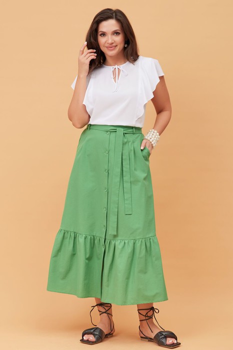 Юбка женская А-силуэта длиной миди. Передние половинки со складками, с боковыми наклонными карманами, с застёжкой на петли и пуговицы по центру. Спинка цельная, с талевыми вытачками. По низу отрезная деталь со сборкой. Пояс притачной, сзади с резинкой, спереди с завязками. Изделие без подкладки.