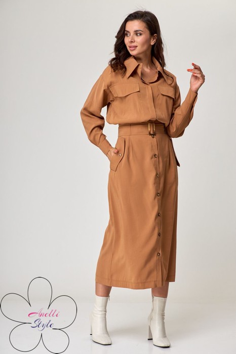 Юбка А-образного силуэта, длины миди, на широком притачном поясе, со шлевками. По переду выполнены боковые карманы с клапанами и функциональная планка на петли и пуговицы. Пояс из основной ткани, с пряжкой.