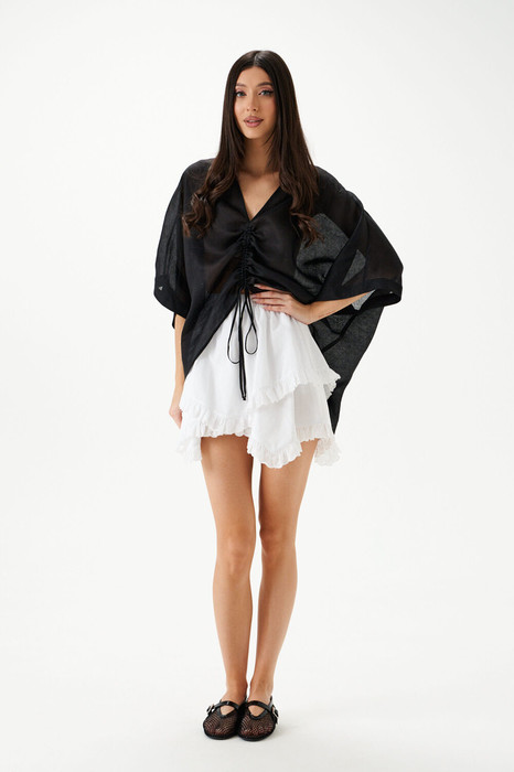 Юбка ассиметричного кроя выполнена из льняного полотна белого цвета. Характеристики: двуслойная, пояс на резинке, нижний слой ассиметричного кроя, низ изделия украшен хлопковым кружевом, верхний слой выполнен в виде треугольника , низ верхнего слоя украшен хлопковым кружевом. Длина по боковому шву 39 см.