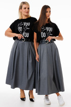 Юбка трапеция выполнена из полотна с черно-белым принтом. Харектеристики: силуэт трапеция, пояс стабильный с шлевками, скрытая застежка на молнии и крючках, декоративные складки, в боковых швах карманы. Длина 42 см.