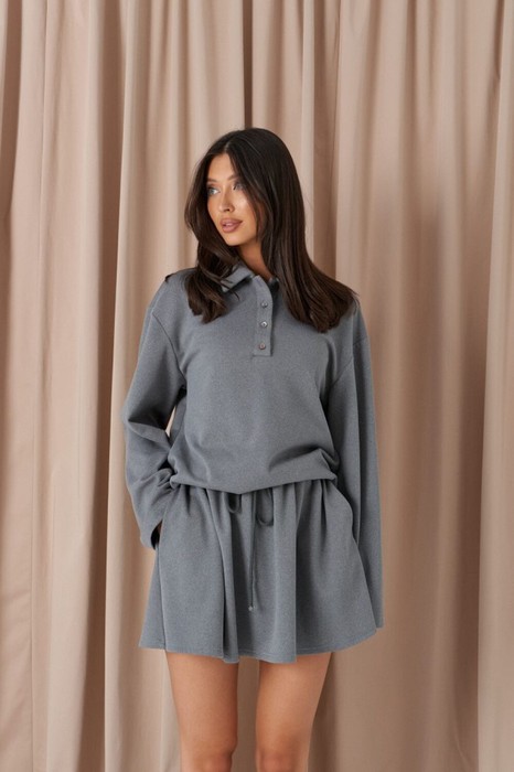 Юбка-мини свободного кроя. Выполнена из плотного трикотажа серого цвета. Без подкладки. Пояс не резинке со шнурком. Без застёжки. В боковых швах карманы. Длина юбки по боковому шву 38,5 см