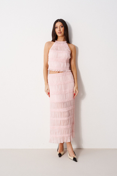 Юбка-миди полуприлегающего силуэта. Выполнена из прозрачной фактурной ткани нежно-розового цвета. С подкладкой в длине мини. Пояс на резинке. Застежки в изделии нет. Длина 90 см