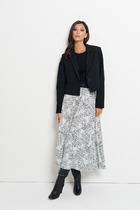 Юбка прямого силуэта, с фигурной кокеткой по переду и разрезом-шлицей. Заднее полотнище со средним швом, в котором обработана застежка потайная. Верх юбки обработан обтачками.  Длина по боковому шву 64 см. Юбка на подкладке.