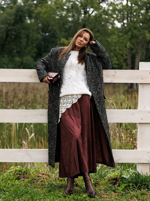 Юбка замшевая длинная А-силуэта на притачном поясе и карманами в боковых швах. Полочка и спинка с центральным швом, рельефами и горизонтальным подрезом. По спинке вверху в центральный шов вставлена металлическая молния. Юбка без подкладки.