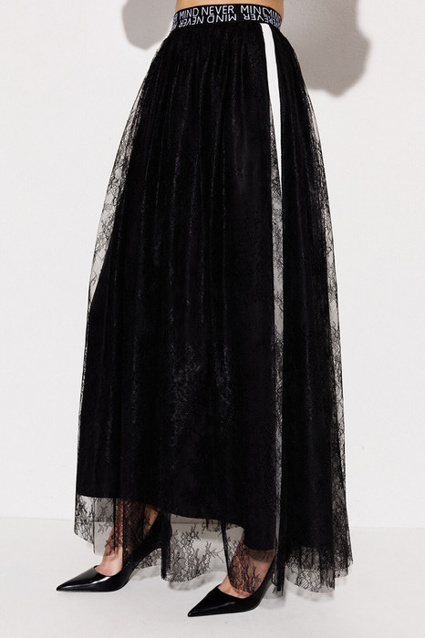 Юбка длинная А-силуэта из кружева на подкладке. Пояс из декоративной резинки со шрифтовой композицией. По бокам лампасы