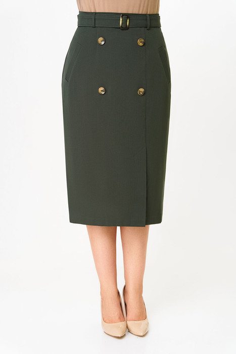 Справа по переду юбки проходит рельеф переходящий в шлицу, ближе к боковым швам расположены листочки, имитирующие карманы. Центр переда юбки украшают декоративные пуговицы.