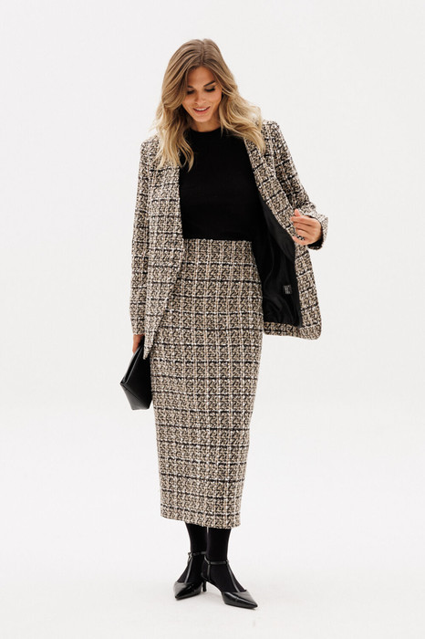 Юбка выполнена из твида. Юбка заужена к низу, длиной миди. Юбка на притачном поясе. Сзади в среднем шве разрез и застежка на потайную молнию и пуговицу. Юбка на отлетной по низу подкладке.
