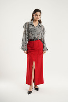 Юбка - солнце макси с узким поясом. В боковых швах расположены карманы. Застёжка на петлю и пуговицу и молнию по спинке.