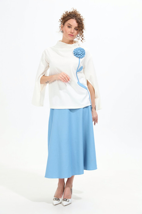 Юбка - солнце с узким поясом. В боковых швах расположены карманы. Застёжка на петлю и пуговицу и молнию по спинке.