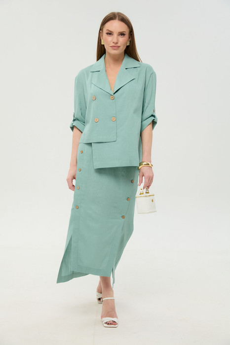 Юбка длиной миди, расклешенная к низу, с асимметричным низом. Пояс притачной, по спинке собран на резинку. Переднее полотнище состоит из трех частей. Правая часть скреплена отделочной строчкой и кнопками. В боковых швах изделия расположены карманы. По спинке изделия идёт средний шов и две вытачки для удачной посадки по фигуре. Юбка без подкладки.